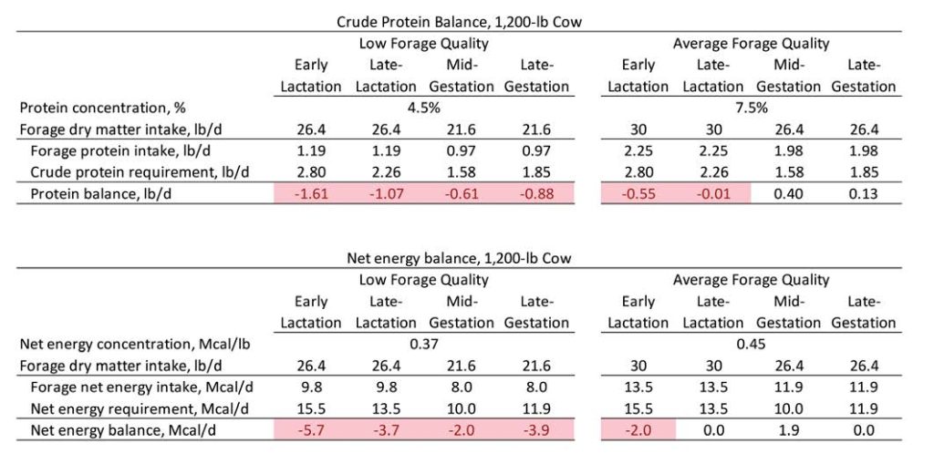 Nutrient Balance – Once we have defined nutrient requirements and estimated supplies, the final step in our process is to calculate nutrient balance, which is nutrient supply less demand, with a negative balance suggesting deficiency and a positive value representing excess. In our example above, we assumed a lactating cow on average-quality forage would consume 2.25 lb of crude protein daily. For the first few months after calving, average crude protein requirements are approximately 2.80 lb/d, leaving a balance of -0.55lb/d. In this scenario, our objective would be to correct this deficiency with supplemental protein in the most cost-effective method we can logistically accomplish. With average-quality forage, we would also expect a deficiency in net energy during early lactation (Table 2).