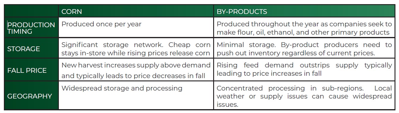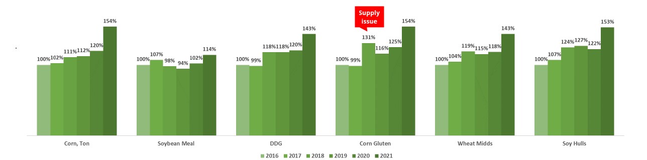 As an example, in 2018, you can see corn gluten prices rose dramatically higher compared to corn. What drove this? A supply shortage of corn gluten due to processing issues at a major producer.